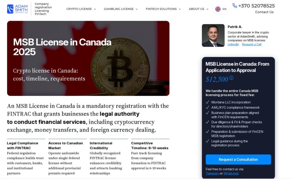Adam Smith built their practice in Lithuania before expanding into North America. Their Canada team now handles both domestic MSB registration and FMSB status for foreign companies serving Canadian customers from abroad.