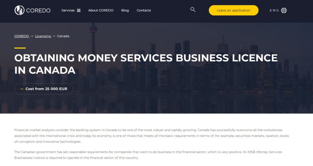 COREDO operates out of Prague with a practice that spans European and North American licensing. Their legal crypto consulting covers MSB registration through FINTRAC, which they have documented in published guides on their website.